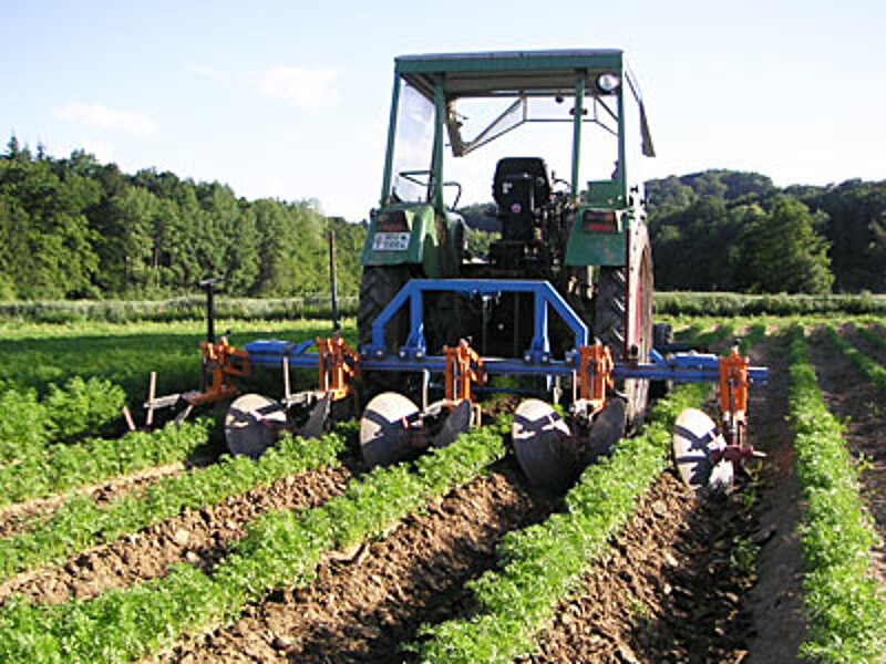 Besonders stolz sind wir auf unsere Namensgeberinnen, die Gelben Rüben. Früher waren es die Futterrüben fürs Fränkische Gelbvieh, heute sind es die Möhren, die auf unseren fruchtbaren Lehmböden in ganz besonderer Qualität wachsen. Wir haben für unseren Standort ein speziell angepasstes Anbauverfahren entwickelt: Auf Dämmen gedeihen sie besonders gut und wachsen formschön heran. Die Dämme erwärmen sich im Frühjahr schneller und fördern so das Wachstum der Rüben. Die Karotten benötigen viel Pflege. Vor allem die Unkrautregulierung, die wir mit Hackmaschine und Handhacke durchführen, ist sehr aufwändig. Etwa 300 Arbeitsstunden pro Hektar benötigen wir von der Aussaat bis zur Ernte.
