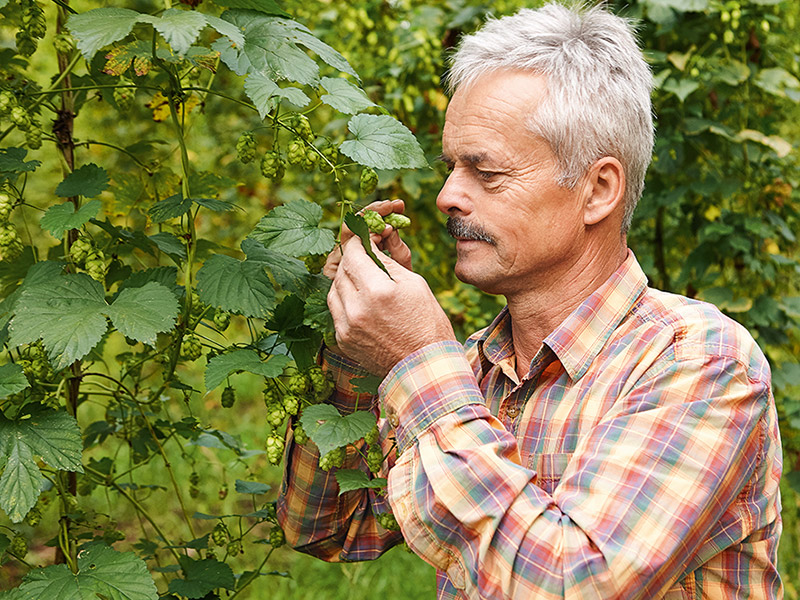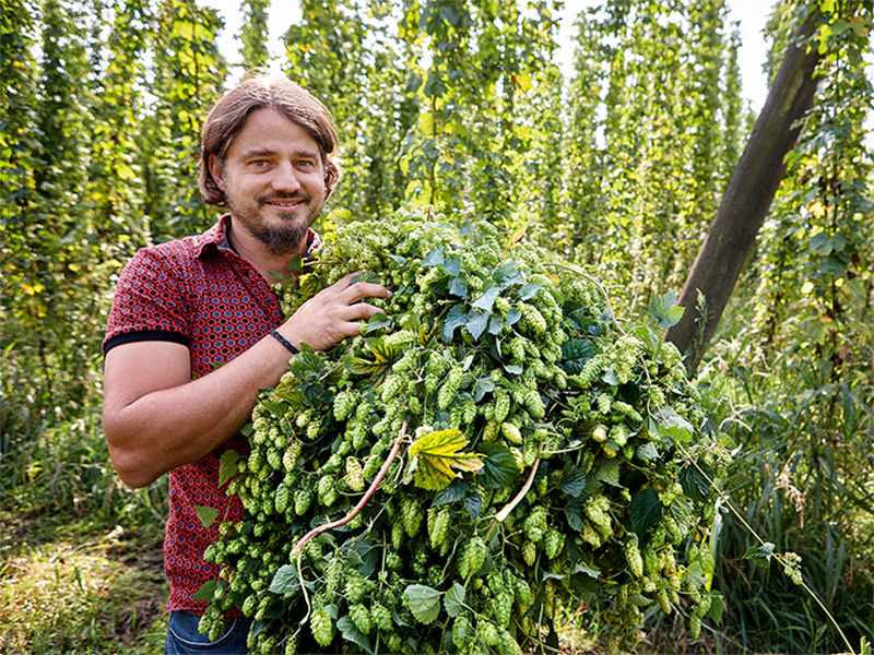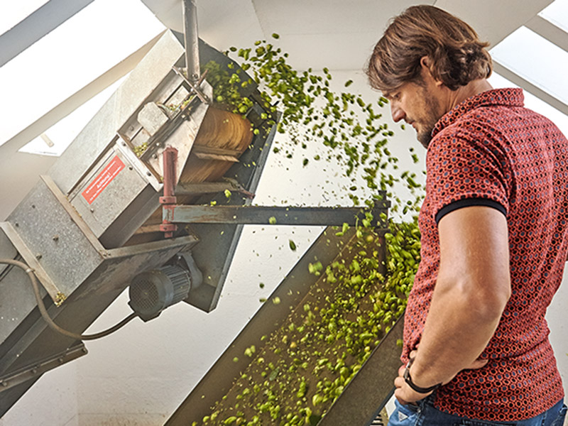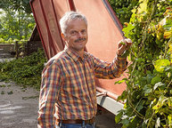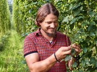 Neben den 15 Hektar Apfelplantage bewirtschaften Peter und Johannes Bentele sieben Hektar Hopfen. Während sie im Winter die Gerüstanlagen reparieren, an denen sich die Pflanzen hinaufranken werden, folgt im Frühjahr die Vorbereitung des Bodens. Dann werden die Unkräuter beseitigt und eine natürliche Düngung eingebracht. Vater und Sohn schneiden den Hopfen zurück, so dass er neu austreibt. Wenn er das dann tut, müssen sie sicherstellen, dass all die Drähte ordentlich hängen, an denen die Triebe später emporklettern. Von da an pflegen die zwei immer wieder den Boden und die Pflanzen, so dass ab Ende August die Hopfenernte beginnen kann.