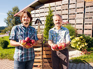 Peter Bentele und sein Sohn Johannes bauen auf ihrem Familienbetrieb verschiedene Apfelsorten und Hopfen "mit Gesicht" an.