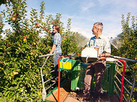 "Eine weitere, technisch hoch entwickelte Maschine verwenden wir für die Arbeit in der Höhe", erzählt Johannes. Auch sie fährt sensorgesteuert durch die Reihen, so dass der Bedienende sich ganz auf die Ernte, die Pflege der Hagelnetze oder den Baumschnitt konzentrieren kann. Sie läuft mit elektrischem Strom, den die Benteles mit ihrer Fotovoltaikanlage selbst erzeugen und von dort in die Batterien leiten, welche die Maschine antreiben. Wie am Boden gibt es auch an den Bäumen ganzjährig etwas zu tun: Äste schneiden, Blüten und Zweige auspflücken, schlechte Äpfel absammeln und die Stämme zum Schutz mit Kalk bestreichen.