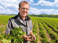 Neben den Erdbeeren, die nicht nur frisch über das VonHier-Programm von Feneberg vermarktet werden, sondern auch im Joghurt und in der Marmelade landen, produzieren die Schimpfles auch Frühkartoffeln und Rhabarber für VonHier. Für die Frühkartoffeln ist der Boden rund um den Betrieb ideal, wie Robert Schimpfle erklärt: „In unserem Boden sind viele große Steine – somit ist er wasserdurchlässig und er heizt sich im Frühjahr schnell auf.“ Schon Mitte Juni sind so die ersten Kartoffeln reif.