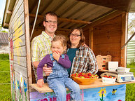 Angelika und Robert Schimpfle erzeugen Erdbeeren, die sie zum Selbstpflücken oder Abholen anbieten. Der größte Teil geht als VonHier-Erzeugnis in die Regale der Feneberg-Lebensmittelmärkte. Hinzu kommen Frühkartoffeln und Rhabarber, die ebenfalls über das VonHier-programm vermarktet werden.