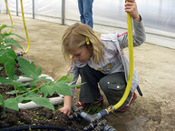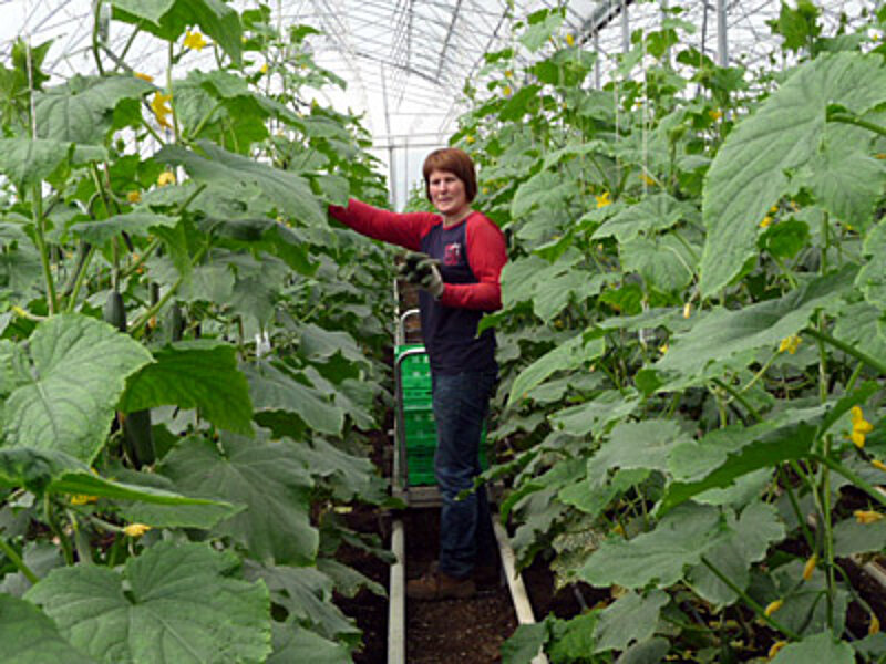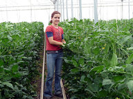 Wir bauen Kohlrabi, Rettich, Tomaten, Gurken, Zwiebeln, Sellerie und Kohl an, außerdem Hokkaido-Kürbis. Unsere Gewächshausfläche umfasst über 7.000 Quadratmeter. Hier versorgen Urszula Kasprzak und Annett Ecker-Schönfeld Gemüse und Jungpflanzen.