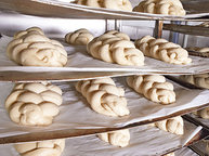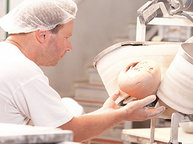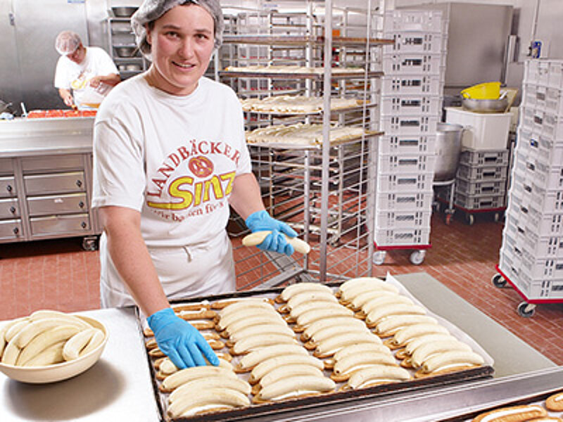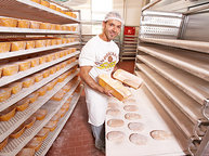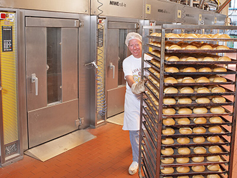 Auch wenn diese Fronten kaum Einblick gewähren – was innen passiert, kann sich sehen lassen: Auf den ersten Blick bestimmen Edelstahl, Technik und computergesteuerte Anlagen das Bild, aber auf den zweiten fallen sofort die Menschen auf, die das Haus mit Leben füllen. "Alles, was körperlich schwer ist, nehmen uns Maschinen ab", erklärt der Leiter der Bäckerei, Reiner Wohllebe. "Doch das Steuern der Backprozesse, das Eingreifen, Fühlen, Empfinden, das machen unsere Bäcker."