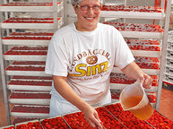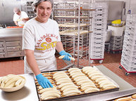 Rund 150 Mitarbeiter, darunter neun Bäcker- und zwei Konditormeister, arbeiten in der Feneberg-Bäckerei, und so ist fast rund um die Uhr Leben im Haus. Gebacken wird in drei Schichten vom späten Nachmittag bis etwa 3 Uhr nachts. Die Mitarbeiter in der Produktion setzen Vorteige an, schneiden Früchte auf, belegen Kuchenschnitten, kontrollieren und steuern die Maschinen und bereiten schließlich das Gebäck für den Transport vor. Auch das Entwickeln neuer Produkte gehört zu ihren Aufgaben. "Ein toller Erfolg sind unsere Krusti", nennt Wohllebe nur ein Beispiel.