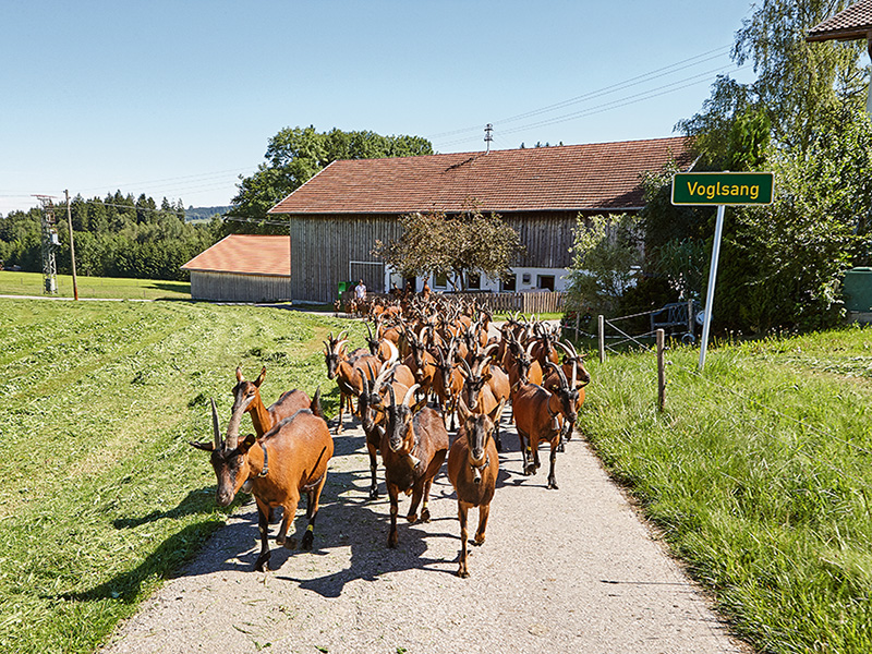 Etliche Herausforderungen hat der einfallsreiche und tatkräftige Landwirt Johannes Egger mit seiner Umstellung auf die ökologische Ziegenhaltung schon geschafft, aber für eine Sache braucht er doch Unterstützung: Den täglichen Weidegang mit den 80 Ziegen, die immer nach dem besten Futter Ausschau halten, schafft er nur mit Hilfe seines Hundes. „Der Weidegang wäre mit Kühen wirklich leichter“, lacht Johannes Egger. Doch für ihn war die Entscheidung richtig: Ziegenmilch wird schließlich immer stärker nachgefragt und höchste Qualität ist für den Oberallgäuer eine Frage der Überzeugung.