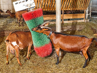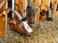Zurzeit stehen 80 bunte deutsche Edelziegen im Laufstall des Kemptener Hofes – Nachwuchs wird in Kürze erwartet. Aus ersten Erfahrungen hat Johannes Egger bereits Konsequenzen gezogen: Er hat extra ein spezielles Fressgitter anfertigen lassen, das nach oben geöffnet werden kann und das einen Sichtschutz zwischen den einzelnen Futterplätzen bietet. Denn Ziegen sind neidisch und lassen sich beim Fressen leicht von ihrer Nachbarin aus der Ruhe bringen. Außerdem verhaken sie sich mit ihren Hörnern beim Ausfädeln aus dem Gitter, wenn es nicht nach oben offen ist. Enthornen kommt für Johannes Egger nicht in Frage: „Wir sind ein Biobetrieb und die Hörner gehören für mich zum ökologischen Gedanken dazu.“ Zwar sei die Verletzungsgefahr durchaus ein Thema, aber durch das neue Fressgitter sei mehr Ruhe in die Herde gekommen und auch rangniedere Tiere kämen leichter an ihre Ration. Beim Blick in den geräumigen Laufstall sieht man denn auch viele Ziegen, die sich entspannt zum Wiederkäuen hingelegt haben.
