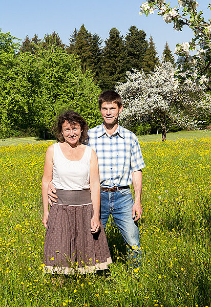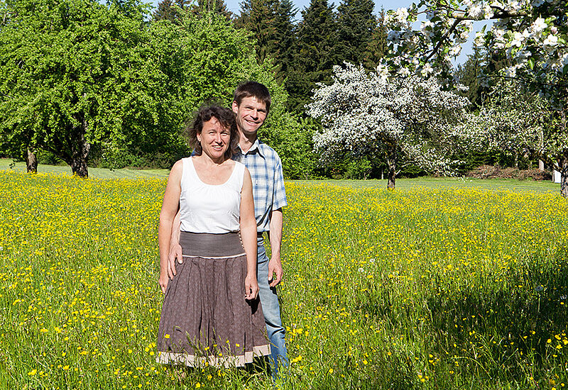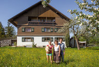 Wenn man auf den Bioland-Hof der Familie Hauber nach Opfenbach kommt, dann ist es fast ein bisschen so, als würde man eine andere Welt betreten. Es ist Idylle pur, die einen hier erwartet: sanft-hügelige Wiesen umgeben das Gehöft, eine Streuobstwiese mit alten Bäumen grenzt an Scheune und Bauernhaus. Der Brunnen plätschert, eine Gans namens Erna watschelt munter vorbei. Simone Hauber lacht: „Es ist schon schön, aber es steckt auch viel Arbeit dahinter.“ Gemeinsam mit ihrem Mann Stefan bewirtschaftet die tatkräftige Westallgäuerin den Milchviehbetrieb, die vier Kinder packen auch regelmäßig mit an. Sowohl Simone als auch Stefan Hauber sind nebenbei berufstätig – sie als Steuerfachgehilfin, er als Postbote. „Von der Landwirtschaft allein leben könnten wir nicht, dafür sind wir zu klein“, sagt Simone Hauber.